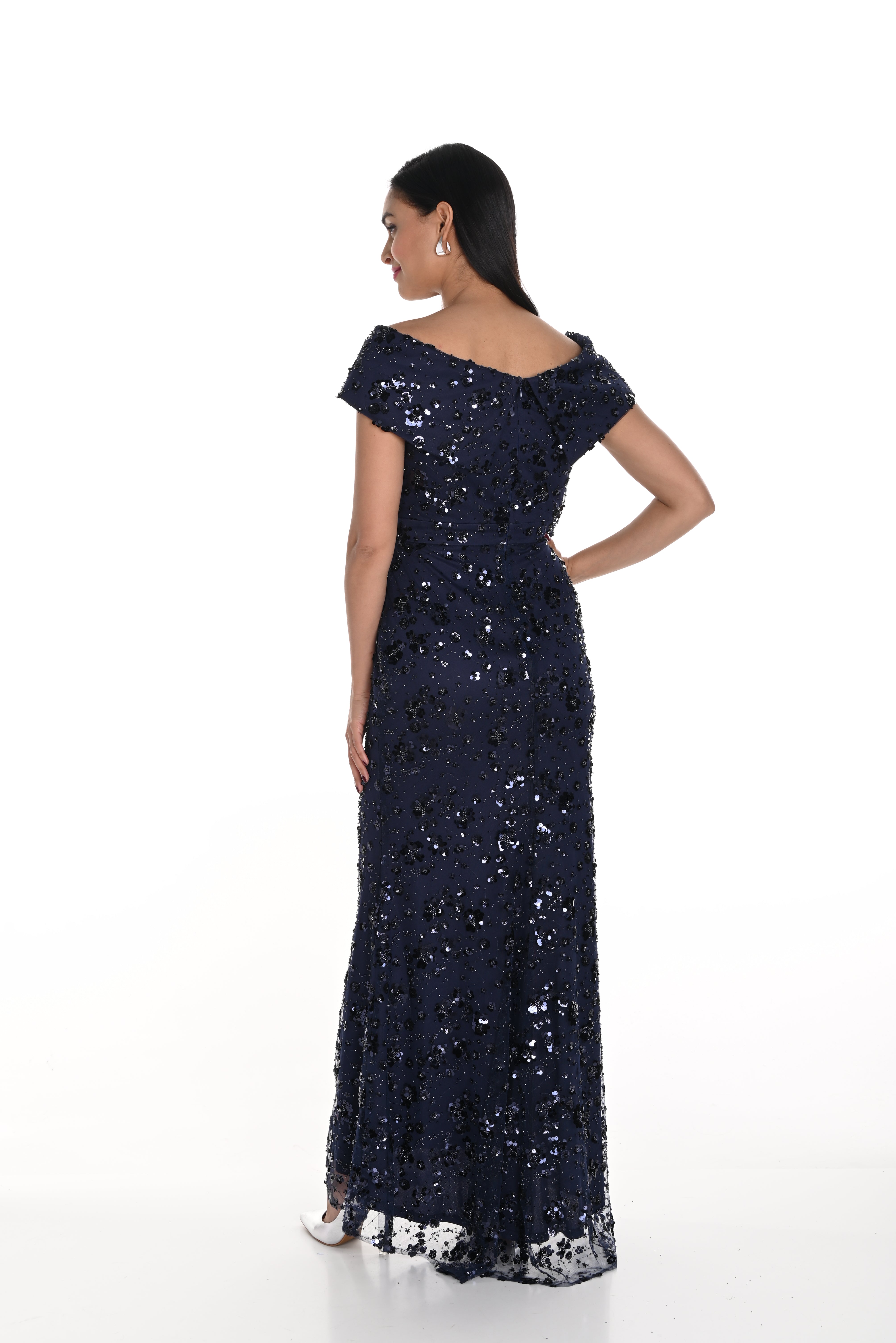Silky Knit And Cascade Off-Shoulder Sheath Gown (JR1055)