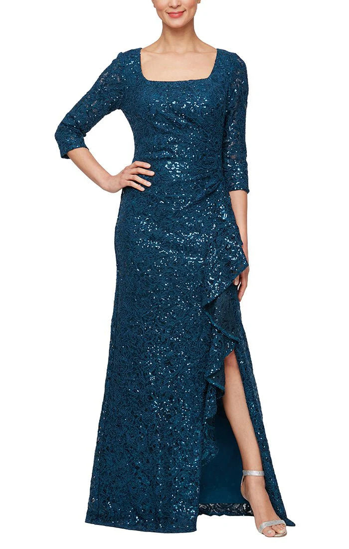 Long Square Neck Dress with Cording Detail & Cascade Ruffle Skirt (AE0011)