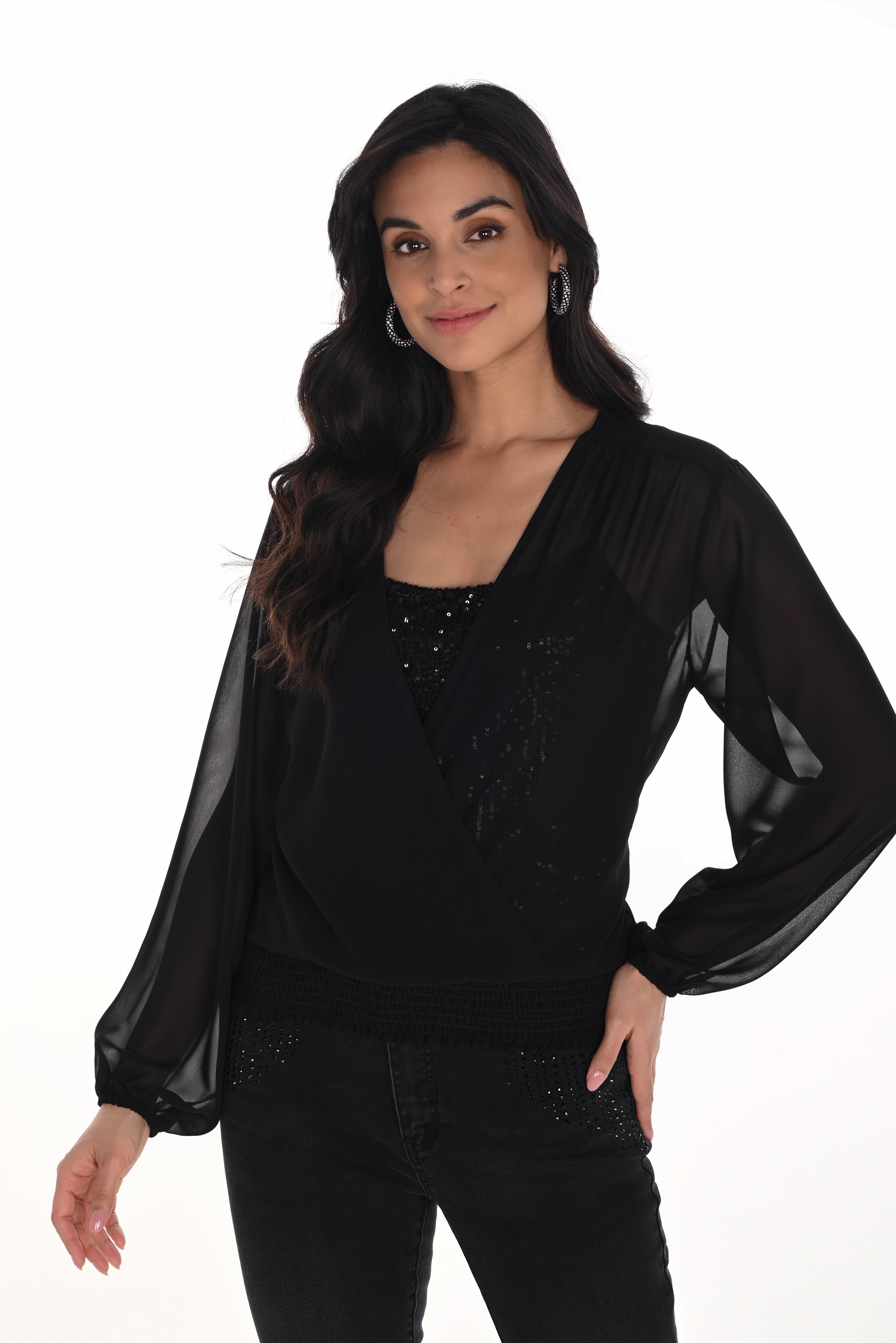Long Sleeve V Neck Top with Crystal Detail (244613F25)